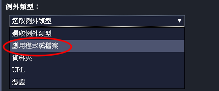 選擇例外類型「應用程式或檔案」。 |