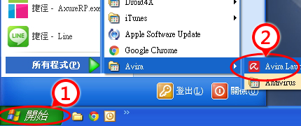 點擊左下角「開始」→開啟所有程式(P)→點選「Avira Launcher」圖示開啟軟體。 |