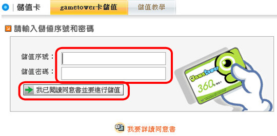輸入儲值序號和密碼,並閱讀使用同意書後,按下【我已閱讀同意書並要進行儲值】。