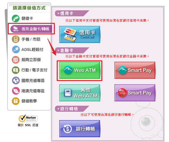 在「儲值淘點」的頁面,選擇「信用卡/金融卡→Web ATM」。