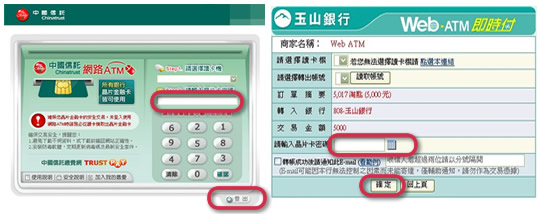在信用卡/金融卡選擇 「中國信託WebATM」或者 「玉山銀行WebATM」 選擇銀行和儲值的品項,閱讀同意書 確認儲值內容,並選填發票資料 進入Web ATM付款介面 儲值成功