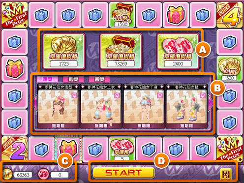 頭獎格:走到此格時,將隨機獲得「頭獎」獎項中的一項道具。
