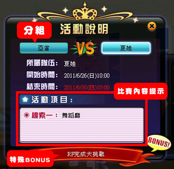 活動期間首次登入遊戲時,會在個人房間中跳出活動說明介面,所有玩家由系統自動分成兩組 (分組方式每次活動皆不相同,有可能是男生VS女生、白皮膚角色VS其他膚色角色…等)