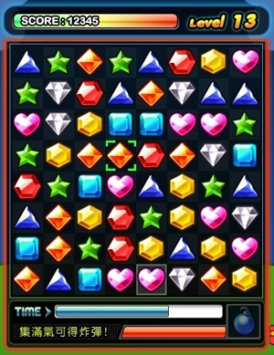 單人進行 單人遊戲採時間制,時間倒數至0則遊戲結束。 遊戲過程中藉由相同顏色寶石連線,消去寶石,取得分數、時間,以及集氣。 當集氣條集滿氣可取得炸彈,炸彈可直接削除周圍9宮格範圍內寶石,賺取高分。