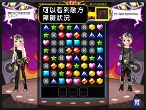 雙人PK 雙人模式進行時,藉由消去寶石同時,會隨機在敵方寶石方塊區放置障礙,當敵方被障礙佈滿無方塊可消除時,就可獲得勝利。 雙人PK可在遊戲開始前,購買輔助道具使用,每場最多可攜帶三樣