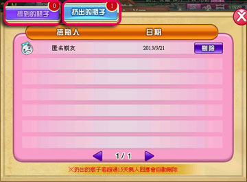 我的瓶子:我扔出的瓶子會被存放在「扔出的瓶子」當中;我撿到的瓶子回覆後會被存放在「撿到的瓶子」當中。