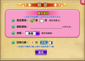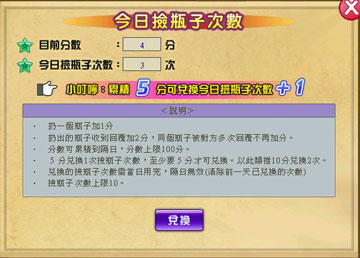 設定按鈕:可設定是否匿名、個性簽名、地區;每累積5分可點選「兌換」使當日撿瓶子次數+1。