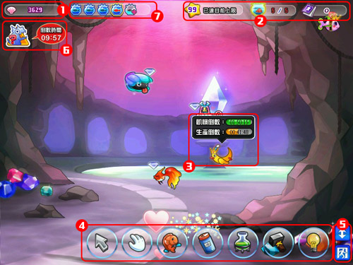 魚缸打怪: 魚缸內每個小時都會出現一次怪物,移動槌子點擊滑鼠左鍵即可攻擊,當怪物血條變白後,即可獲得寶箱(打開後可獲得獎勵)。