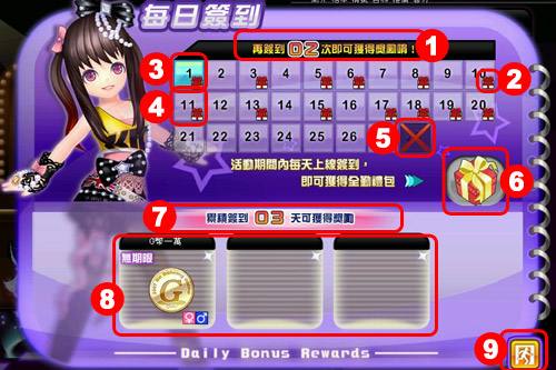 獎勵資訊:此為簽到獎勵之名稱、圖片、性別、期限資訊。