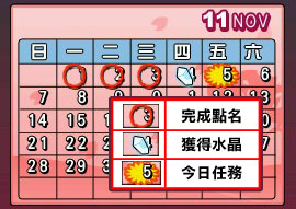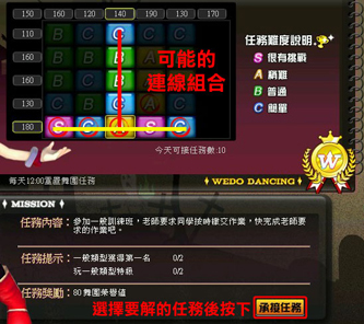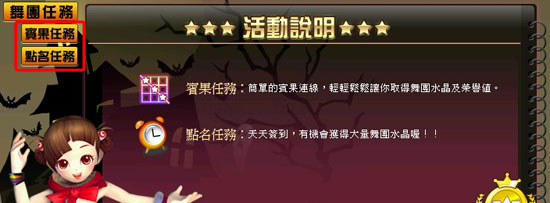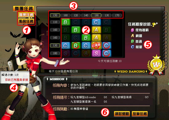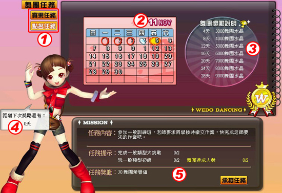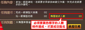 承接任務後,玩家必須完成任務提示內的項目以及次數,即完成任務,可累積舞團達成人數,當黃色標自的人數條件達成時,就算成功點名,可獲得當日任務獎勵。
