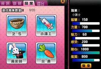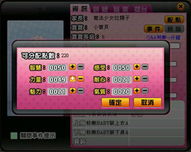 透過挑戰寶寶擂台,可以獲得屬性點數,根據輸贏結果、挑戰對手難度,可獲得不同的自由點數,可分配到欲增加的屬性內,每一點數可使數值+1。 |