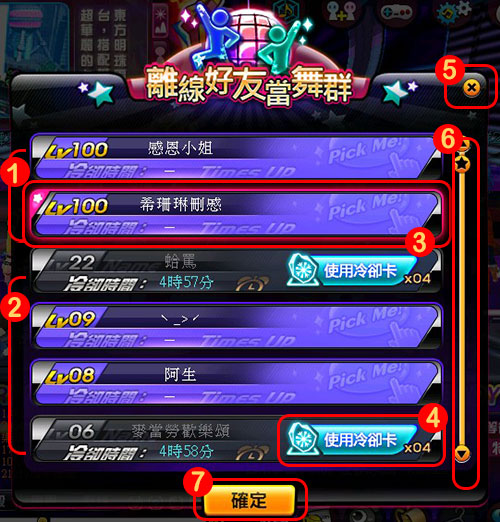 | ※新增好友,也需要等待5小時冷卻時間後才能選為離線好友舞群喔! |