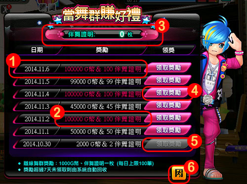 每天最多可以領取10萬G幣+100枚伴舞證明