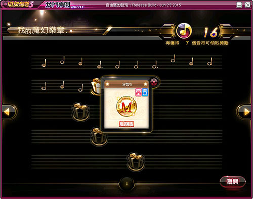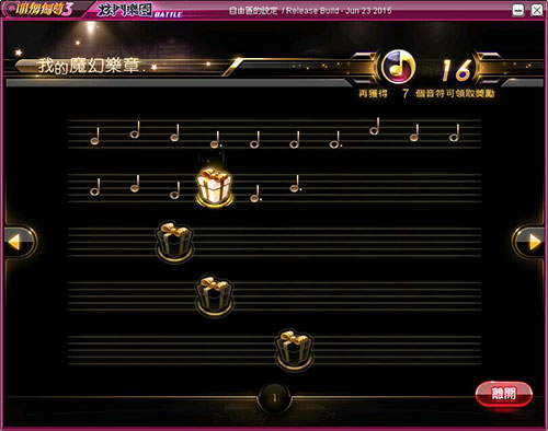 | (6) 點選領獎介面,獲得音符後皆會顯示在譜面上,音符達到定值即可獲得該獎項。右上方顯示目前音符總數量,以及還需多少音符可獲得獎勵。 |