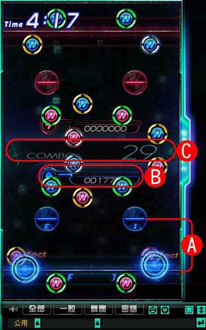 介面介紹: A.判定線 B.集氣格&個人分數 C. COMBO數 玩法: 遊戲剛開始前,系統於判定線發球給雙方,玩家需配合節奏打擊並將球反彈給對方,打擊評價越高,反彈次數越多,球速越快,累積能量還可放技能做出殺球陷害對手,刺激又有趣!