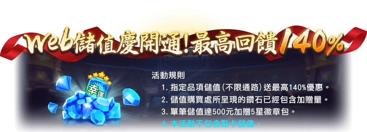 遊戲中將不定期推出儲值優惠活動,詳細資訊請參考官方公告與儲值頁面說明。