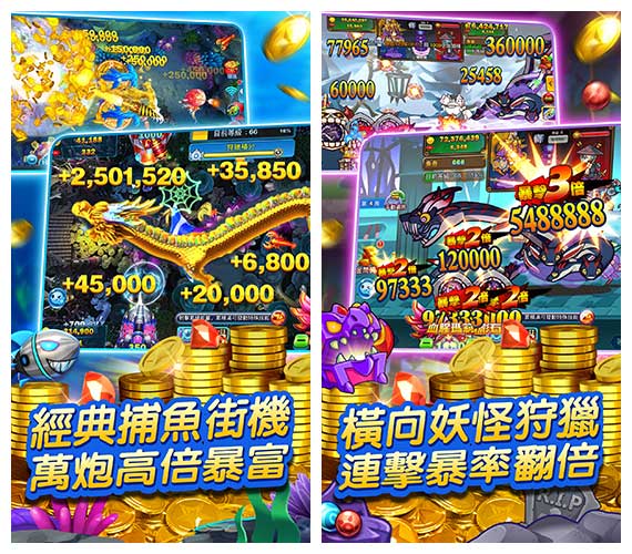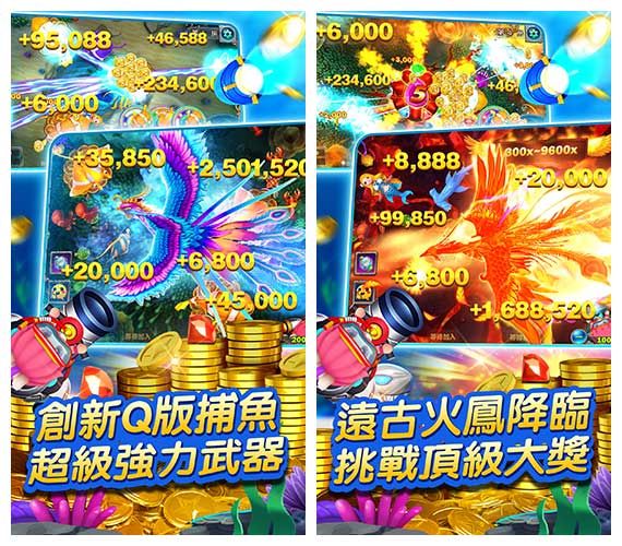 經典捕魚街機移植,多款特色捕魚機台,畫面豐富華麗,享受高倍爆獎快感!