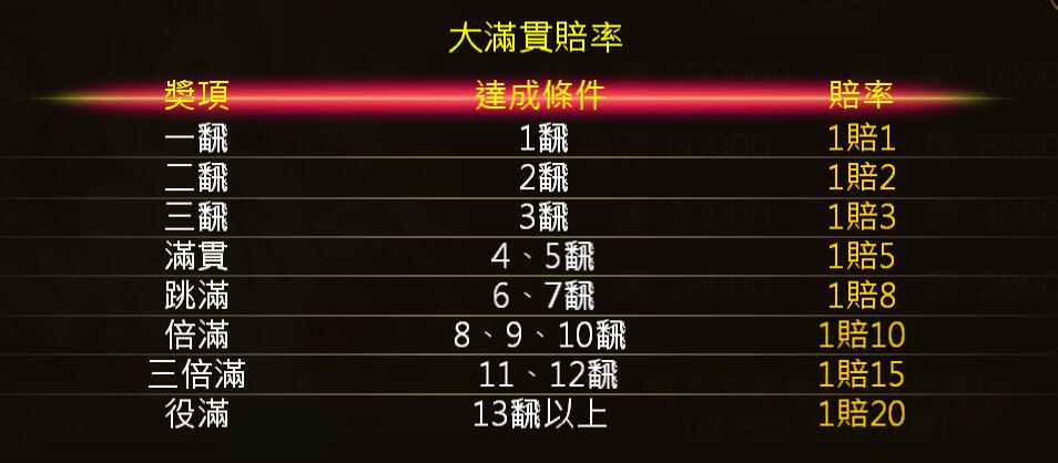 | 役滿 | 等同於13飜,難以湊成的牌型、最大胡牌型態,稱為役滿役;也可飜數累計達成,稱為累積役滿 |